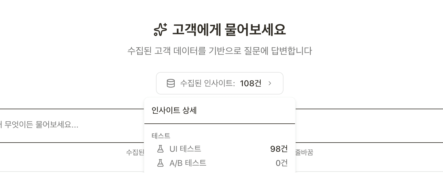 ๋ชจ๋ ๊ณ ๊ฐ ๋ฐ์ดํฐ๊ฐ ํ๋๋ก ํตํฉ๋์์ต๋๋ค.ํผ๋๋ฐฑ ์์ ฏ, AI ์ธํฐ๋ทฐ, ์ธ์ ๋ฆฌํ๋ ์ด, ํ ์คํธ ๊ฒฐ๊ณผ ๋ฑ ๋ชจ๋ ๋ฐ์ดํฐ ํตํฉ